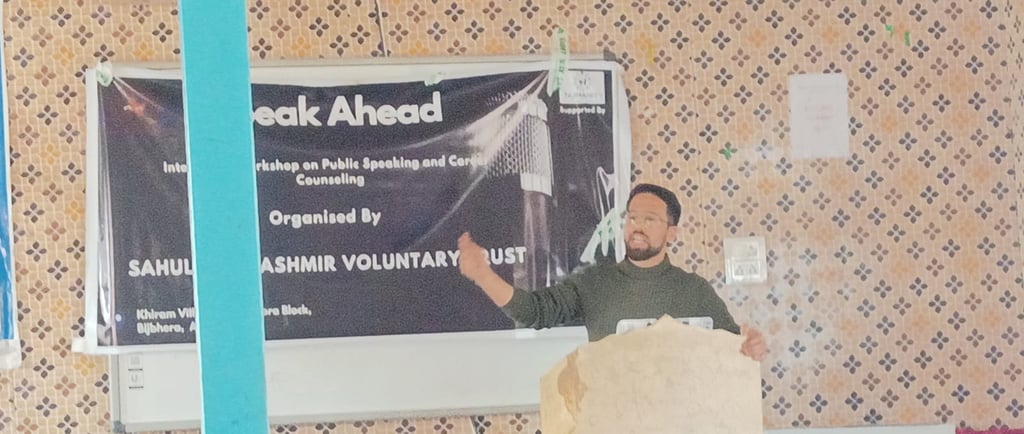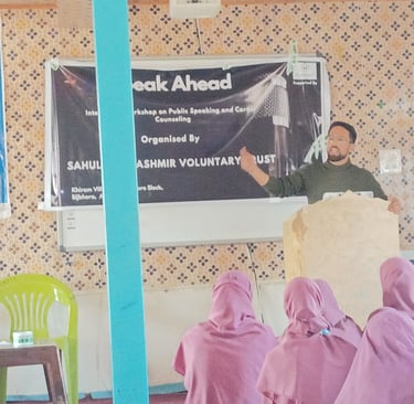 Sahuliyat Kashmir Voluntary Trust organized a one-day workshop on Career Counseling and Public Speaking at Khiram, Anantnag. The event aimed to empower youth with essential skills, providing guidance on career choices and enhancing their public speaking abilities
